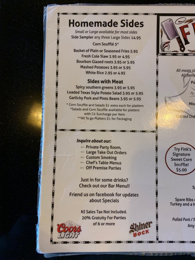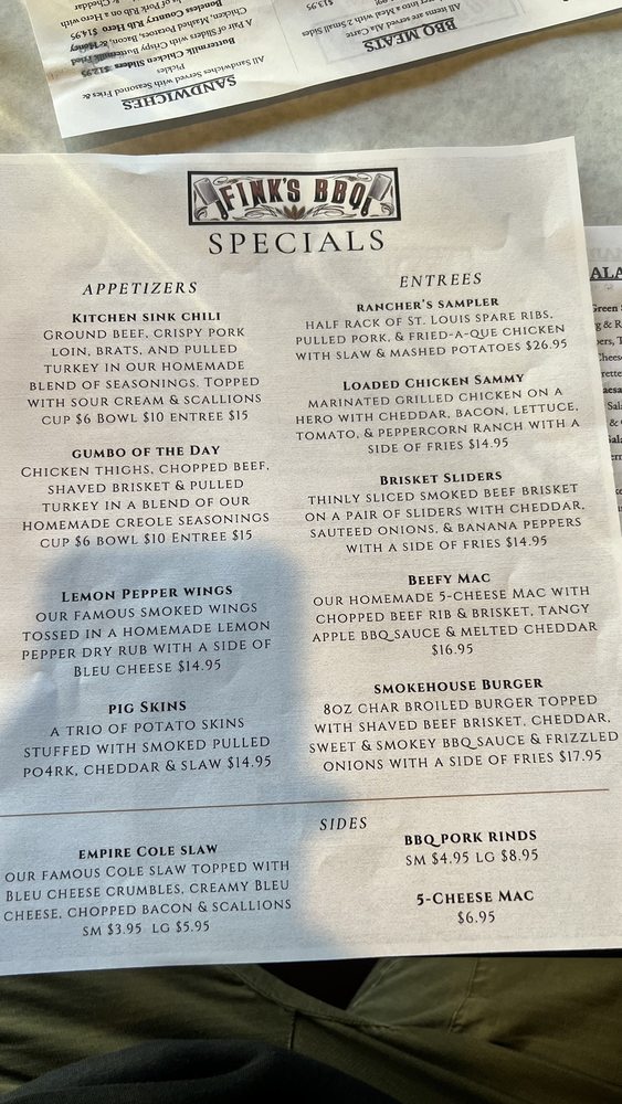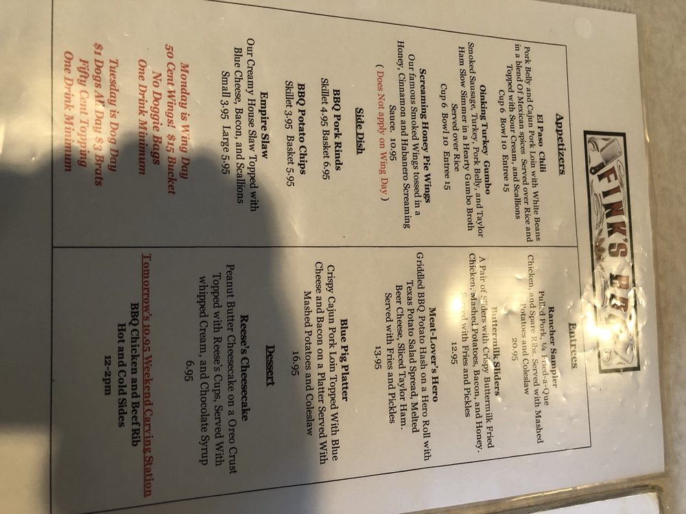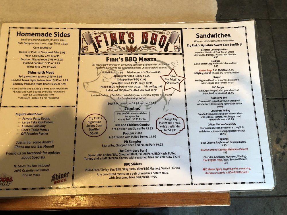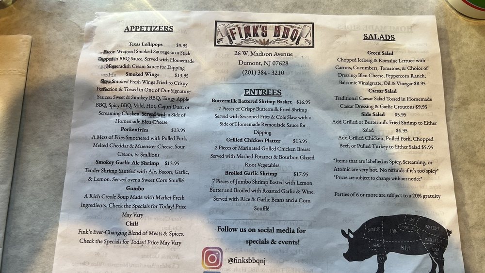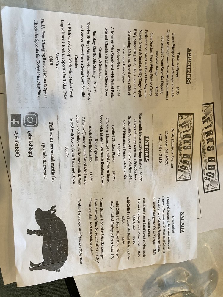 Fink's BBQ Smokehouse in Dumont, NJ offers a wide range of options for food enthusiasts. From vegetarian dishes to meat-lover's paradise, there is something for everyone. With a casual atmosphere and friendly service, Fink's is the perfect spot for lunch, dinner, or even catering for groups. The menu boasts a variety of BBQ delights, from smoked wings to succulent ribs and mouth-watering burgers. Customers rave about the flavorful meats, savory sauces, and generous portions. The full bar and happy hour specials add to the vibrant dining experience. With street parking available and free Wi-Fi, Fink's BBQ Smokehouse is a must-visit destination for those craving delicious BBQ flavors in a cozy setting.